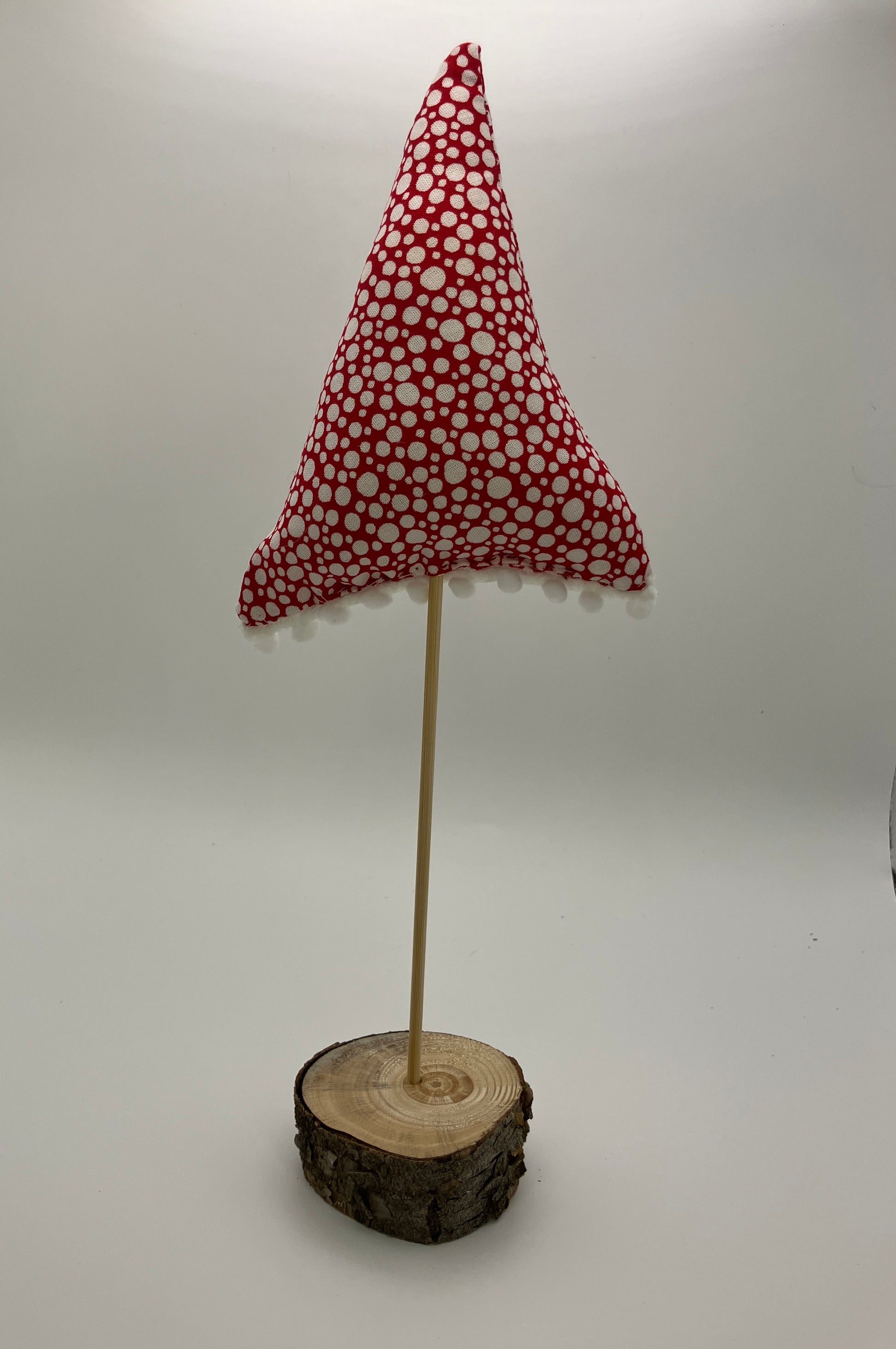 Red and White snowball fabric tree with white pompoms. Handmade with a bamboo and pine base. Measures 12 inches tall by 4.5 inches wide.