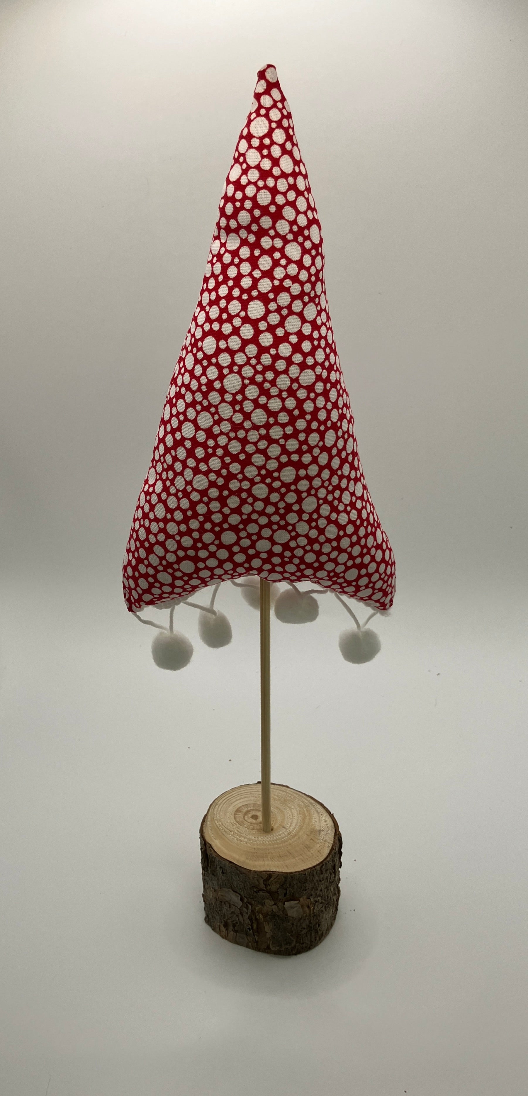 Red and white snowball fabric tree with white pompoms on a bamboo and pine tree base. Measures 13.5 inches tall by 4.25 inches wide.