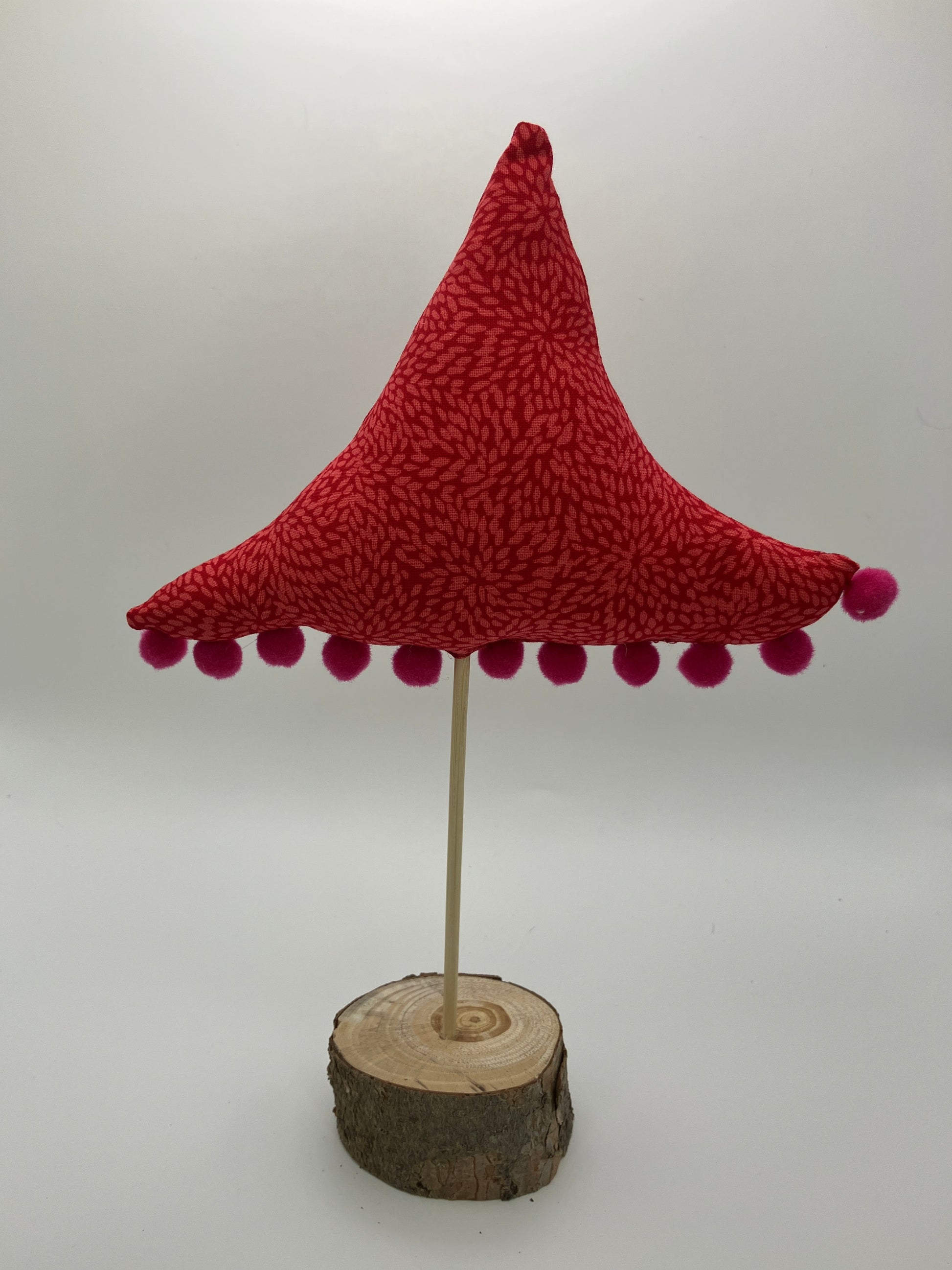 Small handmade holiday tree with red, light red fabric and pink pompoms. Bamboo and pine tree base. Measures 11 inches tall by 7.5 inches wide.
